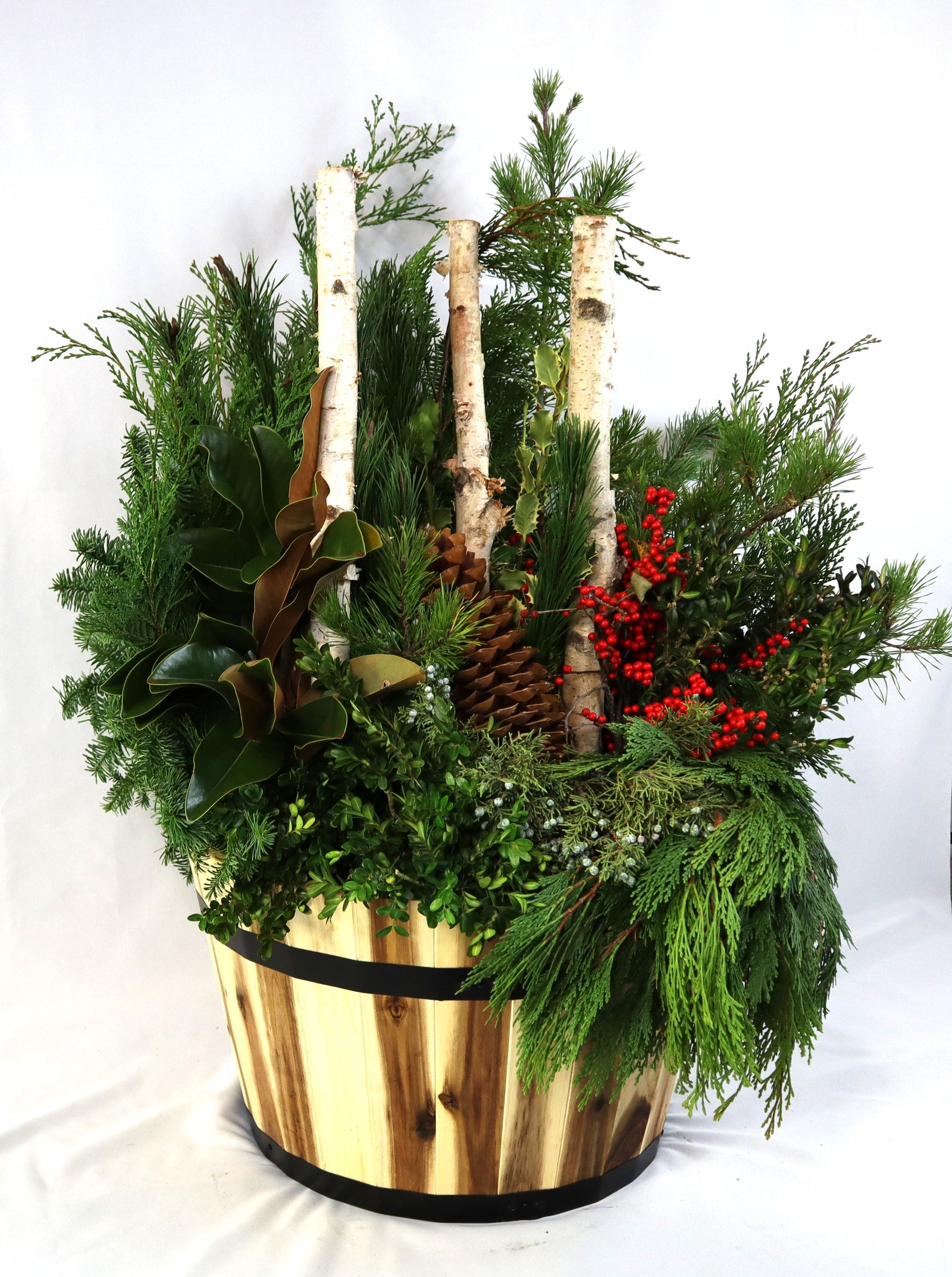 This stunning winter arrangement is designed in a real 21" acacia wood barrel, offering a high-end, natural look that elevates any porch or entryway. Overflowing with fresh winter greens, magnolia, boxwood, cascading cedar, large pinecones, winterberry, and tall birch branches, it blends classic holiday color with rich woodland texture.