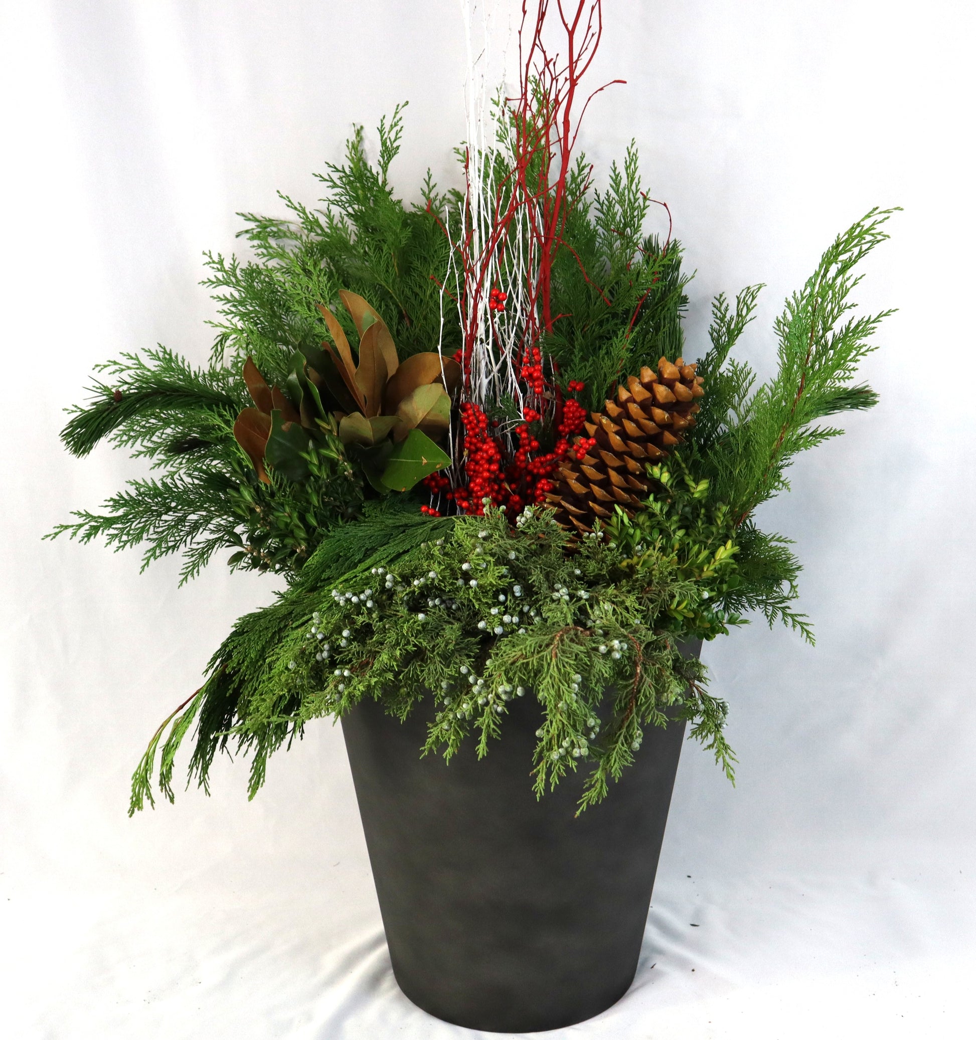 Each arrangement is built with fresh, fragrant greenery including cedar, pine, juniper, and magnolia, with vibrant winterberry, white- and red-tipped branches, and oversized sugar pine cones for texture and height. The result is an elegant, layered winter display that lasts throughout the season.