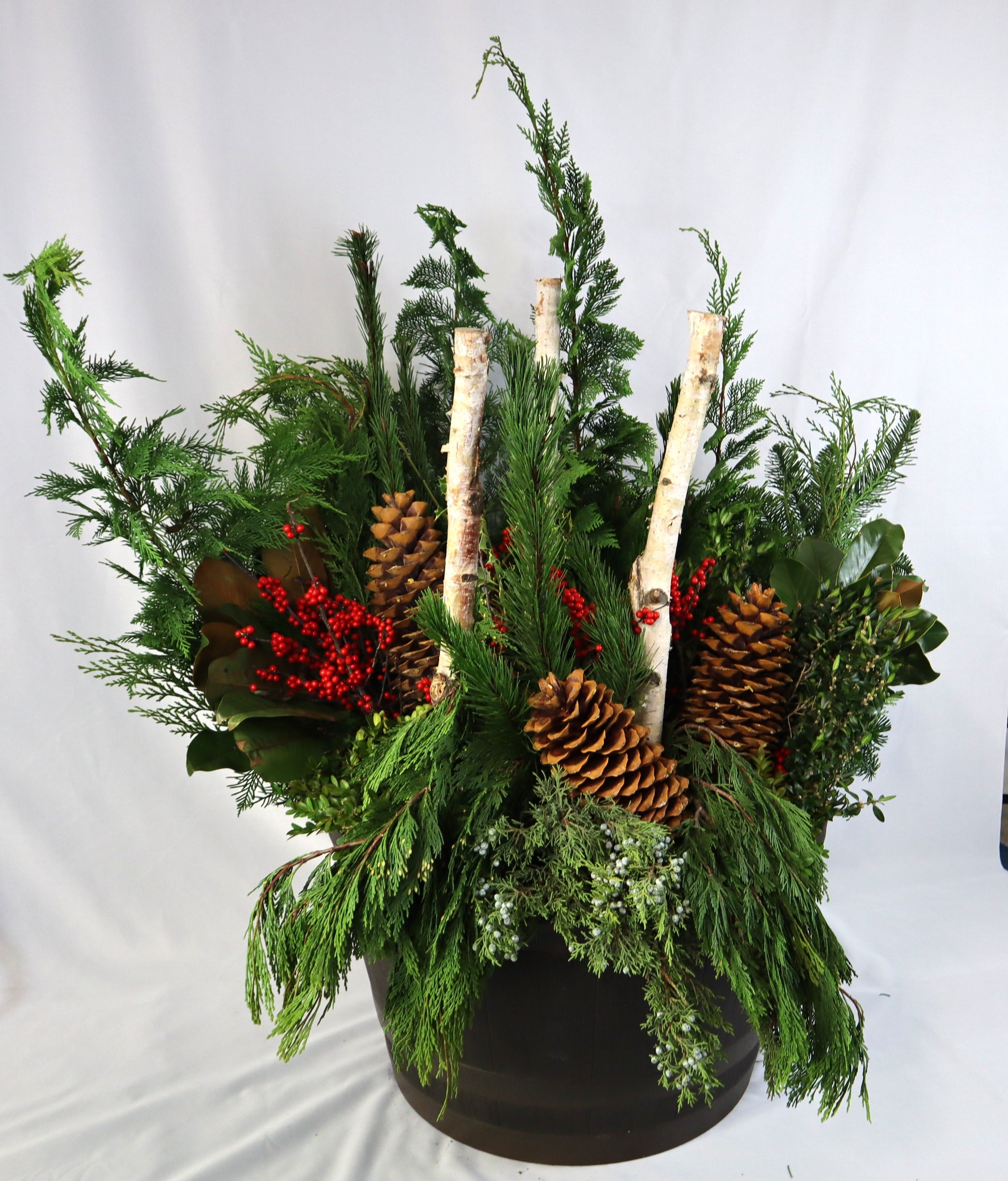 Our largest and most dramatic winter arrangement, designed in a rustic whiskey-barrel style planter for maximum porch presence. This oversized display is packed with lush fresh greens, cascading cedar, magnolia, huge pinecones, vibrant winterberry, and tall natural birch branches for a bold, woodland winter look.